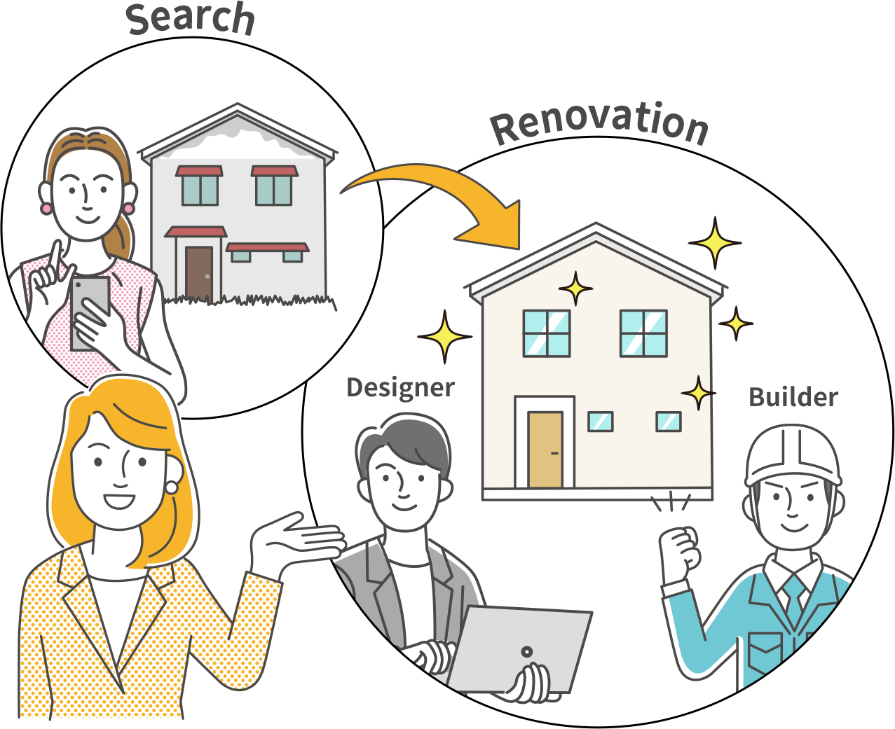 物件決定後、当社コンシェルジュが、デザイン会社と施工業者にリノベーションプランの提案を依頼。お客様は提案された内容と金額を比べながら採用プランを決めるだけで、元は空き家だったおウチがデザイナーズ住宅に生まれ変わります。